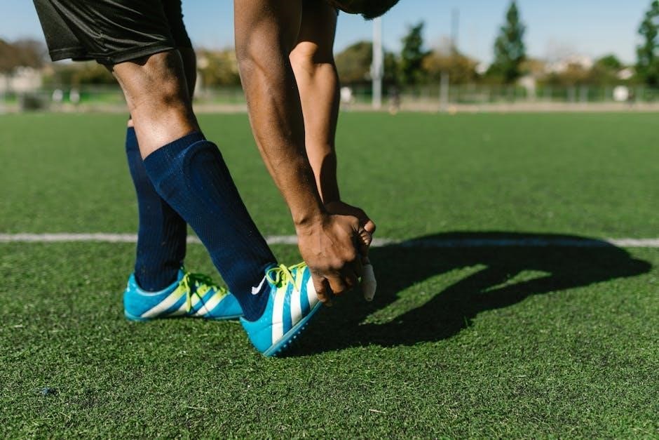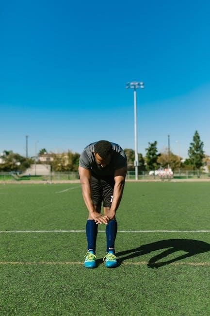 Recovery and injury prevention are essential for maintaining player health and performance․ The program emphasizes foam rolling, stretching, and dynamic warm-ups to improve flexibility and reduce muscle tension․ Structured cool-down routines post-workout aid in muscle recovery and prevent soreness․ Adequate sleep (7-9 hours) is stressed to allow the body to heal and adapt․ Nutrition plays a role, with guidelines for optimal recovery-focused eating․ Techniques like compression garments, ice baths, and massage are incorporated to minimize muscle fatigue․ Additionally, injury prevention exercises target weaker areas, and physical therapy is integrated to address existing issues․ Proper hydration is also highlighted to support overall recovery and muscle function․ Prioritizing recovery ensures athletes can train at maximum intensity while reducing the risk of injury, ultimately enhancing performance and longevity in the sport․